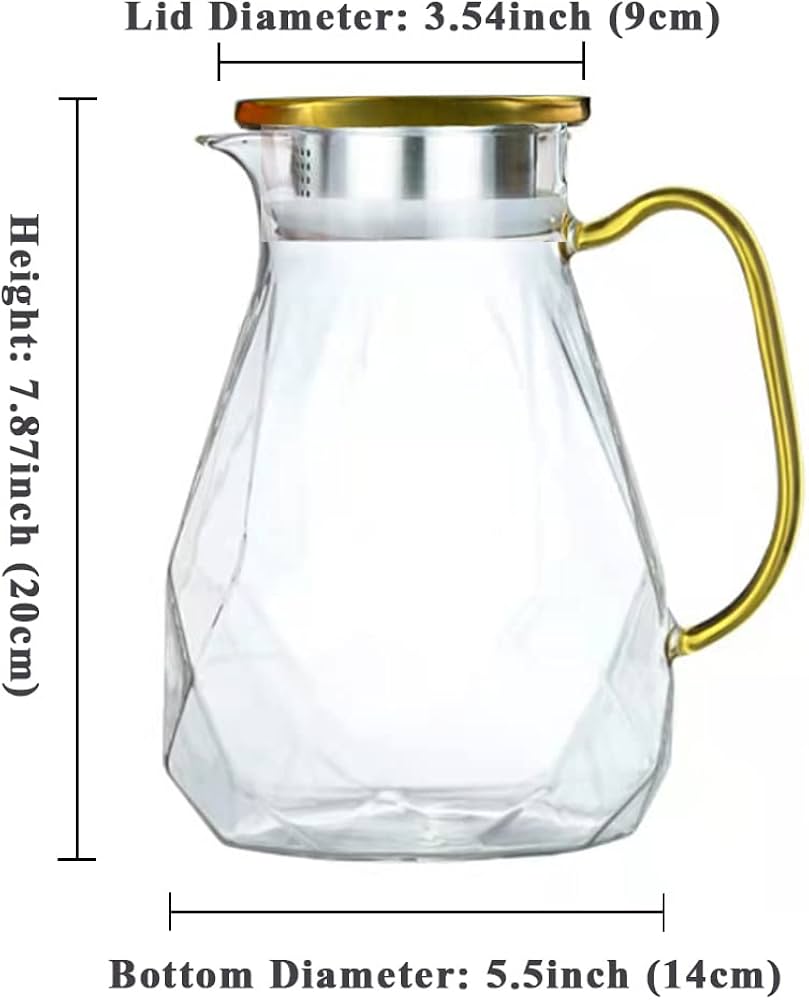 La jarra es perfecta para bebidas frías, como café helado, té helado, jugo, agua infundida casera y más. Estos son muy adecuados para Navidad, regalos de cumpleaños, bodas, día de San Valentín, aniversarios y inauguración de la casa como regalos para los amigos que te rodean. 【Regalo perfecto】 Es un excelente regalo para cualquier ocasión. Jarra de agua con tapa de verano jarra transparente jarra fácil jarra... Jarra de vidrio de agua de té helado única, leche de café y jugo, jarra de vidrio grabada para bebidas con asa ; Uso · Jugo, Hogar, Hotel, Bar ; Peso · 1351g 【Jarra de jugo】 Hecho de material acrílico de grado alimenticio, sin BPA y duradero, puede verter agua hirviendo en él de manera segura. Bebedero acrílico para Bebidas, Jarra con Tapa y asa, Jugo de Jarra Agua Plastico Jarra De Leche Hervidor De Rayas 1800ml | Cuotas Sin Interés Jarra Agua Cristal 2 Litros