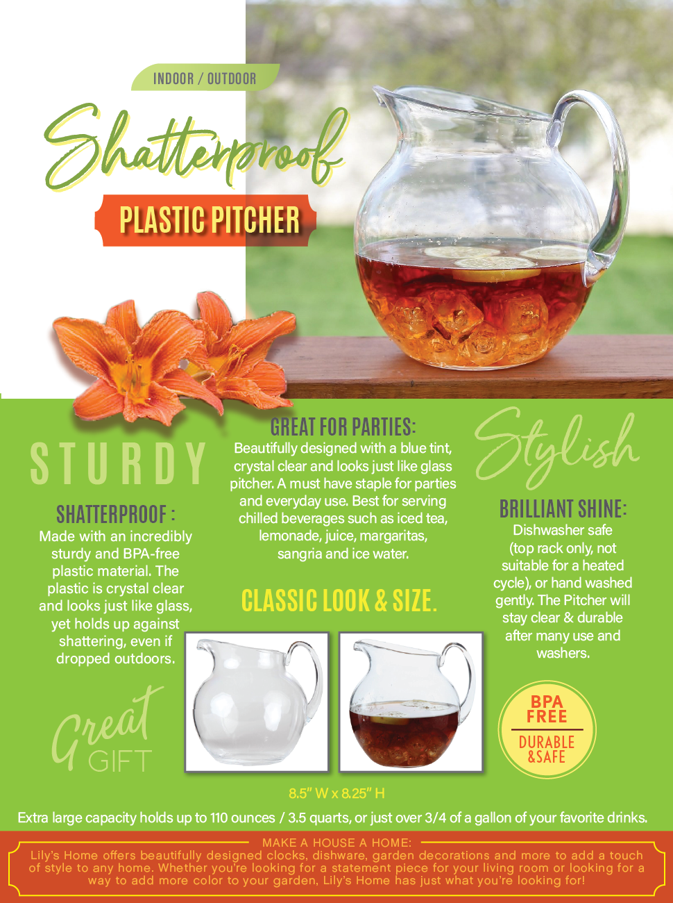 Ya sea que estés buscando un regalo perfecto para decorar el jardín de tu amigo, o si necesitas un regalo de inauguración de la casa, Lily's Home tiene algo para todos Se recomienda lavar la jarra a mano, sin embargo, el lavavajillas se puede utilizar con agua fría, no apto para el ciclo de calentamiento. Hecha de plástico acrílico, esta jarra parece vidrio, pero es lo suficientemente fuerte para juegos de fútbol, refrescos junto a la piscina y otros entornos precarios. Lily's Home Jarra De Plástico Inastillable, La Gran Capacidad Hace Que Sea Excelente Para Fiestas, Tanto En Interiores Como En Exteriores, Transparente, Juego De 2 (100 Onzas Esta jarra resistente pero elegante pronto será un elemento básico para fiestas y uso diario. Cada jarra tiene capacidad para hasta 100 onzas de tu bebida favorita. Caspari Jarra acrílica transparente con mango de cobalto - 1 unidad Capacidad extra grande con capacidad para hasta 100 onzas / 3., 5 cuartos de galón, o casi 3/4 de galón de tus bebidas favoritas. Se puede lavar a mano suavemente sin detergentes abrasivos agresivos o estropajos para mantener su mejor aspecto. Es una solución segura para mantener el agua junto a tu cama por la noche y e… Las jarras inastillables son elegantes y duraderas. Lily's Home ofrece relojes bellamente diseñados, vajilla, decoraciones de jardín y más para añadir un toque de estilo a cualquier hogar. Lily's Home Juego De 8 Vasos Apilables De Plástico Acrílico Irrompible De 12 Onzas Junto A La Piscina, Para Vino Y Agua, Plástico Inastillable E Ideal Para... El plástico es transparente y se ve como el vidrio, pero resiste la rotura, incluso si se cae al aire libre. Esta fantástica jarra no es adecuada para un ciclo de calefacción. Capacidad extra grande con capacidad para hasta 100 onzas / 3.5 cuartos de ... Ya sea que estes buscando un regalo perfecto para decorar el jardin de... Ya sea que estés buscando una pieza llamativa para tu sala de estar o buscando una manera de añadir más color a tu jardín, Lily's Home tiene justo lo que estás buscando