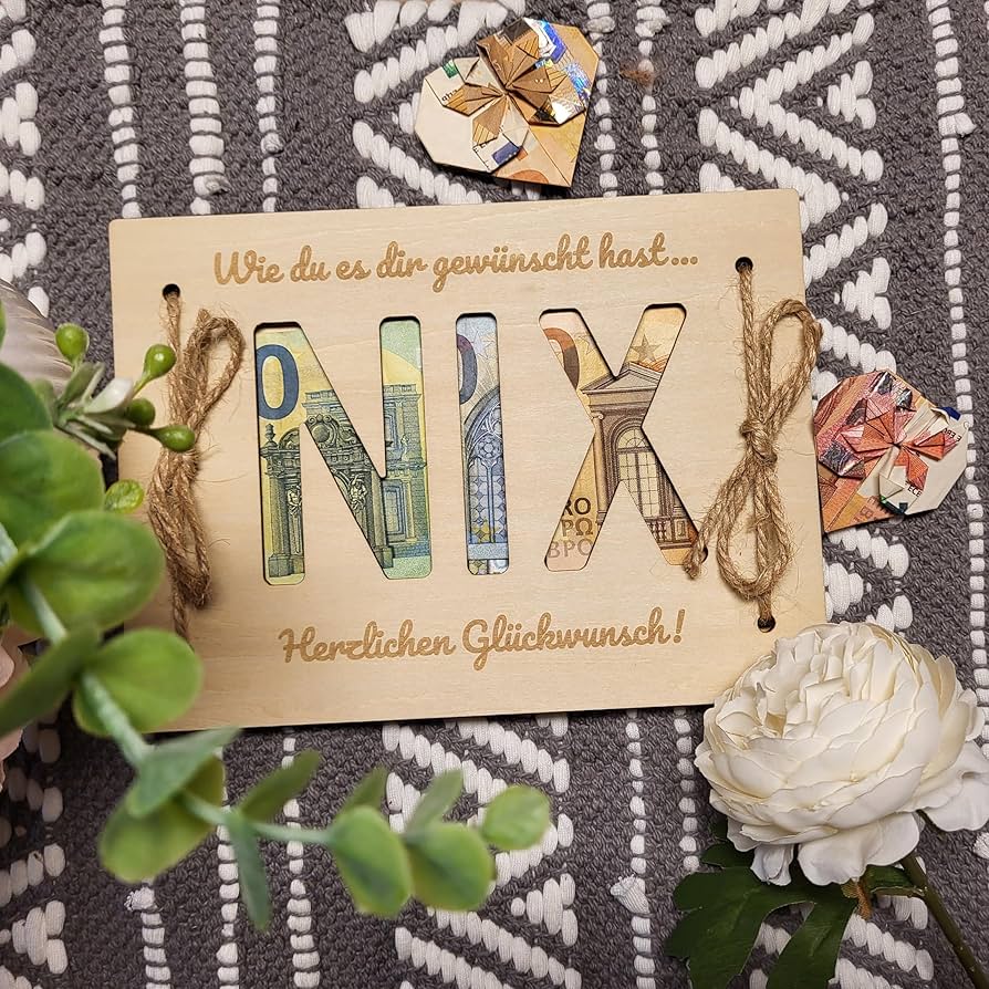 El día de la boda marca una de las situaciones más emocionales en la vida de los amantes y marca una nueva fase de vida caracterizada por la lealtad DEJAR SUS FELICIDADES En la parte trasera también tienes un corazón en el que puedes añadir tu inscripción individual. Material: Madera laminada de abedul de 3 mm La decoración no está incluida. Puedes colocar fácilmente la cantidad de dinero deseada entre las decoraciones de madera y colorear el texto con él. Contenido: 1 tabla de madera frontal; 1 tabla de madera trasera; 1 papel blanco como capa intermedia; 4 tornillos. TARJETAS DE REGALO | Tarjetas de dnero, Regalos para navdad... El paquete 1 tabla de madera frontal 1 tabla de madera 1 papel blanco como capa intermedia 4 tornillos Es un producto natural, por lo que puede haber variaciones en la superficie y el grano. Tarjetas Para Formas Originales De : Elegantes Y Divertidas Regalar Dinero Así puedes darle al regalo tu toque personal. ¿Estás invitado a un cumpleaños y no sabes qué regalar? ¿O quieres regalar al niño de cumpleaños palabra literalmente nada? Entonces nuestra tabla NIX de madera para billetes es el regalo perfecto. Tamaño: 18 x 18 x 0,7 cm. Reutilizable: el producto es diferente de las tarjetas de felicitación ordinarias o regalos de cumpleaños, se puede reutilizar, y con un gancho en la parte posterior, también puede colgarlo en cualquier lugar de su casa como decoración y recuerdo. Producto hecho a mano Los tableros delanteros y traseros están interconectados por 4 tornillos. Ya sea tu nombre, felicitaciones, un pequeño texto personal o los nombres de los destinatarios. Descubre formas únicas y creativas de regalar dinero. Aquí tienes 30 formas de hacer que tu próximo regalo de dinero en efectivo sea memorable Bueno, entonces no regalas nada del todo, pero nadie se ha quejado de un regalo de dinero y una risa de la cumpleañera también te garantizaste. Esquema De Regalo En Blanco Y Negro Regalo Blanco Y Negro PNG Regalo de dinero NIX I Regalos de boda I Cumpleaños I Bautizo I Navidad I Dinero Regalo I Dinero Embalaje I Regalo I Regalo I Dinero de corazón 3 mm de grosor cada placa de madera Nuestros regalos de dinero son las tarjetas de felicitación más estables, gracias a 3 mm de grosor cada placa de madera. El regalo ideal para amigos o conocidos que simplemente quieren nada/nix para su cumpleaños. Una vez más, alguien en el círculo de amigos y familiares, que no desea nada para su cumpleaños y ya lo tiene todo? Con esta original tarjeta de madera puedes cumplir exactamente este deseo Detrás de la palabra nada puedes colocar maravillosamente uno o más billetes y pegarlos.